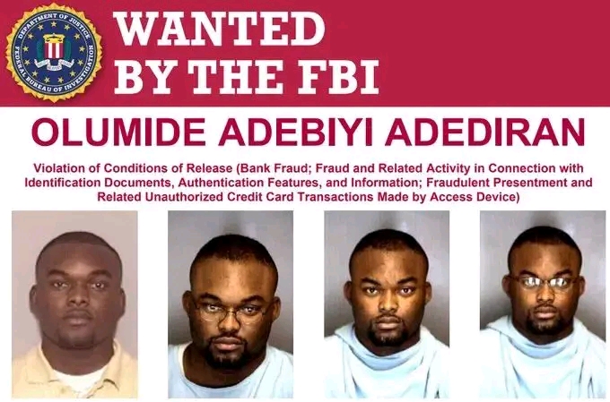 “Olumide Adebiyi Adediran is wanted for violation of conditions of release,” the FBI stated. “On January 2, 2002, a federal arrest warrant was issued for Adediran in the United States District Court, Central District of Illinois, Urbana, Illinois, after he was charged with violation of conditions of release.”