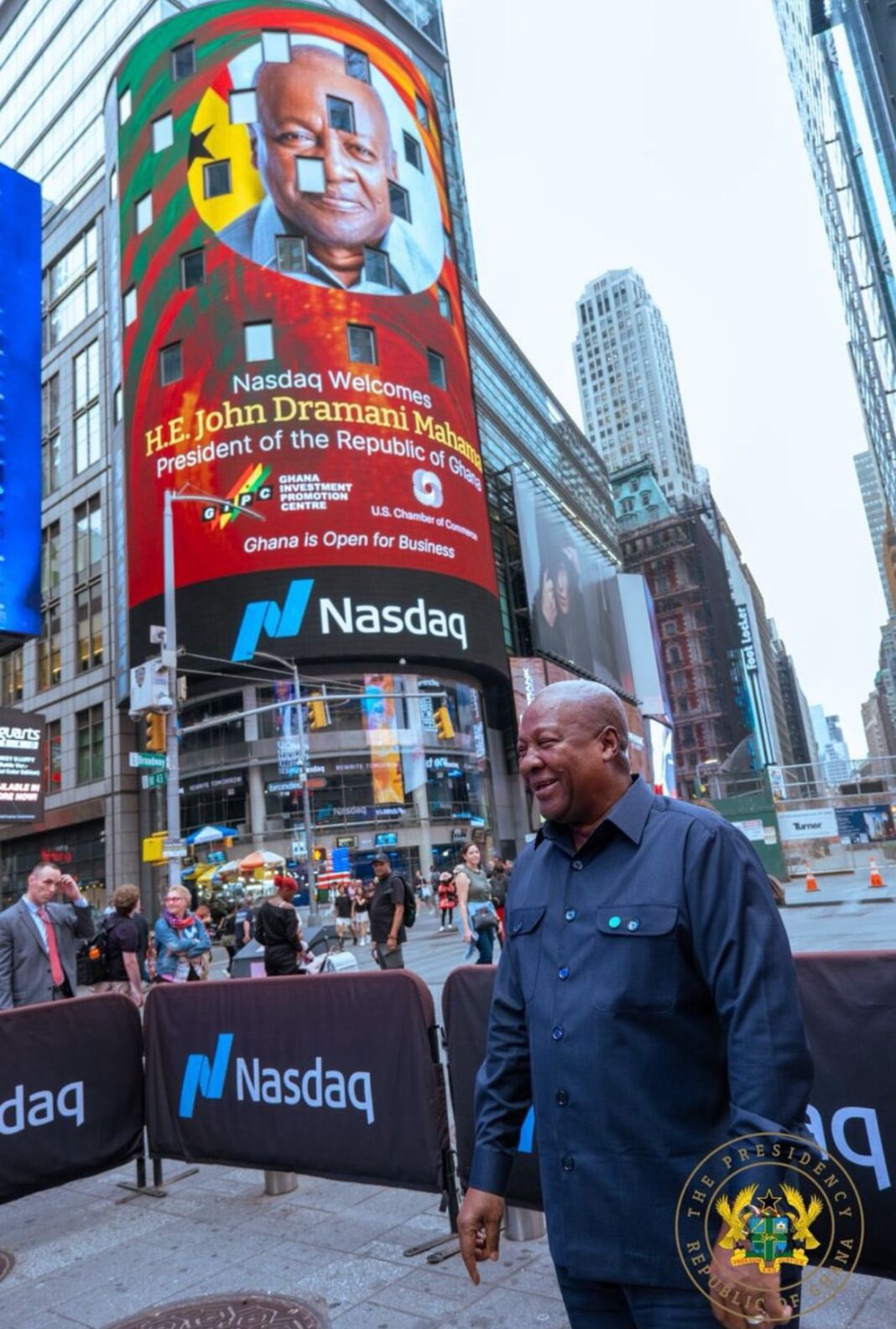 John Dramani Mahama arrived in New York this week with twin stages: a policy pitch at the United Nations General Assembly and a high-visibility business outreach in Manhattan’s financial district, where his image appeared on Nasdaq’s Times Square billboard and he rang the opening bell. Both gestures were part of a coordinated push to sell a message “Reset Ghana” and “Ghana is open for business” but together they exposed enduring tensions about substance versus spectacle, domestic credibility, and the politics of image making for fragile economies.