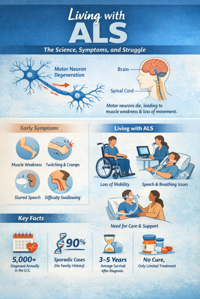 Because ALS erodes physical function but not mental acuity, emotional and psychological coping are crucial. Patients often describe the growing gap between their awareness and their bodies’ shrinking capabilities as one of the hardest parts of the journey. Caregivers and health professionals emphasize communication, comfort, and dignity for those living with the disease.