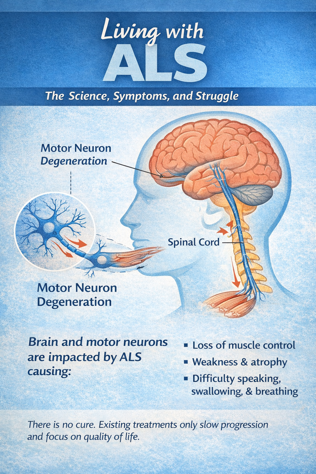 Most people living with ALS eventually lose the ability to walk, use their hands, talk clearly, swallow food, or breathe independently. The disease typically progresses over a period of three to five years after diagnosis, though there can be variability; some people experience slower progression, others faster. There is currently no cure, and existing treatments aim only to slow decline or support comfort and quality of life.